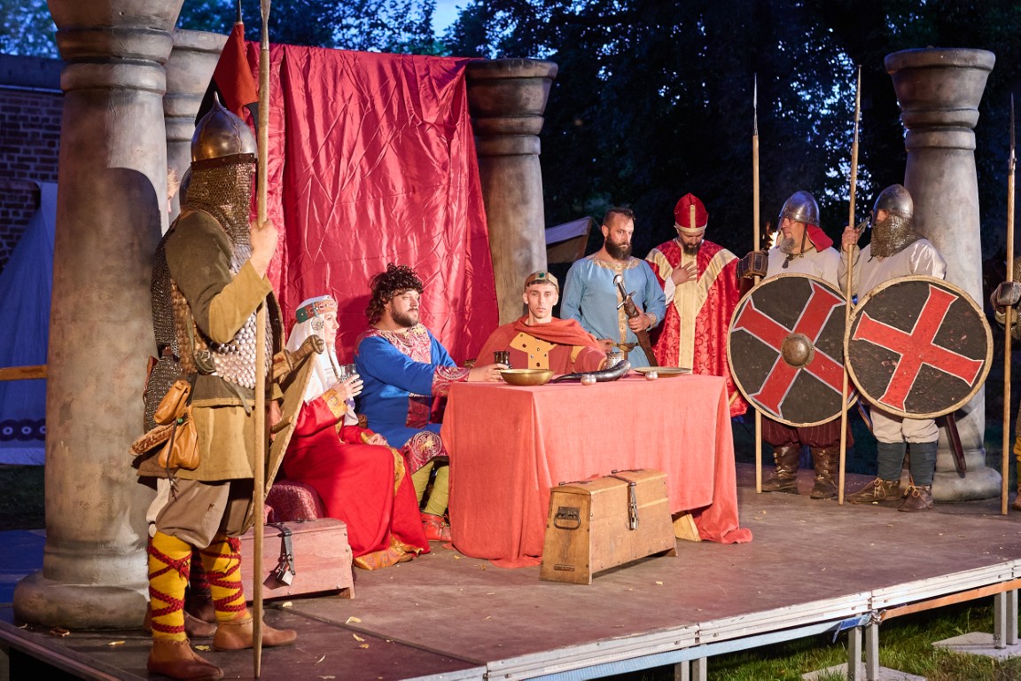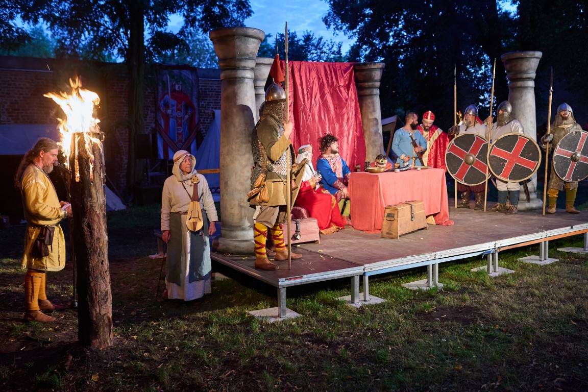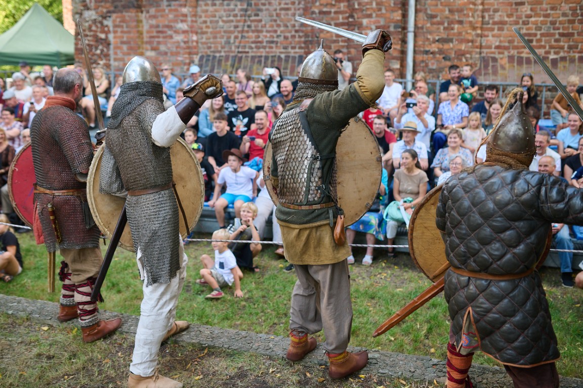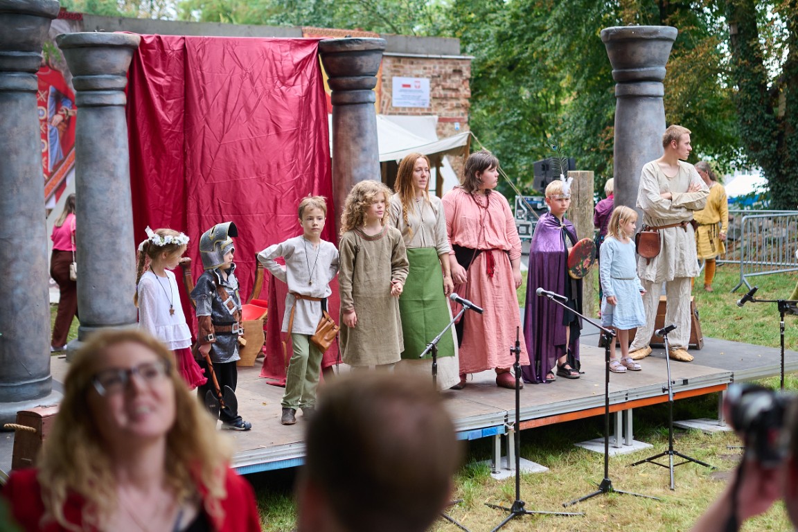 Choć od popołudnia plac wokół ruin klasztoru augustianów tętnił życiem, to największą atrakcją była inscenizacja historyczna, podczas której Bolesław Chrobry został koronowany na pierwszego króla Polski. Ten doniosły moment, którego jubileusz obchodzony jest w tym roku w całej Polsce, zyskał niepowtarzalny wymiar za sprawą scenografii, średniowiecznych strojów, precyzyjnie przygotowanych akcesoriów i muzyki, skomponowanej specjalnie na tę okazję przez Piotra Brodę. Niesamowitą inscenizację, uzupełnioną muzyką i światłem, stworzył Igor Górewicz, który wraz z odtwórcami historycznymi z Drużyny Grodu Trzygłowa przedstawił bieg życia Bolesława Chrobrego od narodzin, przez największe sukcesy na polach bitew, aż po koronację na pierwszego króla Państwa Piastów. Drobiazgowo przygotowane przedstawienie wywarło ogromne wrażenie na widzach nie tylko ze względu na wierne oddanie realiów epoki i autentyczność rekwizytów, ale także dzięki poruszającej muzyce i pełnej szczegółów narracji, które, połączone w spójną całość, utkały wspaniałą historię o wielkości rodu piastowskiego.