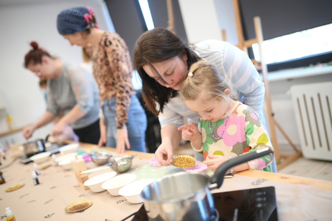 W sobotę od rana w salach warsztatowych MOK-u było gwarno i kolorowo, a kobiety małe i duże z radością tworzyły biżuterię, mydełka, kosmetyki, a także misie na szydełku. To wyjątkowe święto kobiety i dziewczynki postanowiły spędzić razem, łapiąc wspólne chwile i zatrzymując w pamięci piękny czas bliskości. Na warsztaty przyszły dziewczynki, mamy, babcie, ciocie, przyjaciółki – wszystkie z uśmiechem na twarzy i pozytywną energią, która wibrowała w całym budynku, po kolei udzielając się pozostałym.
