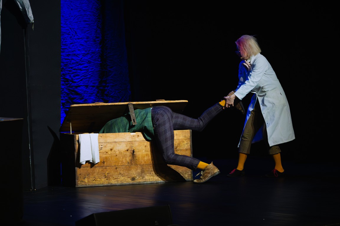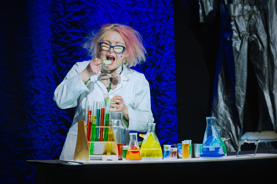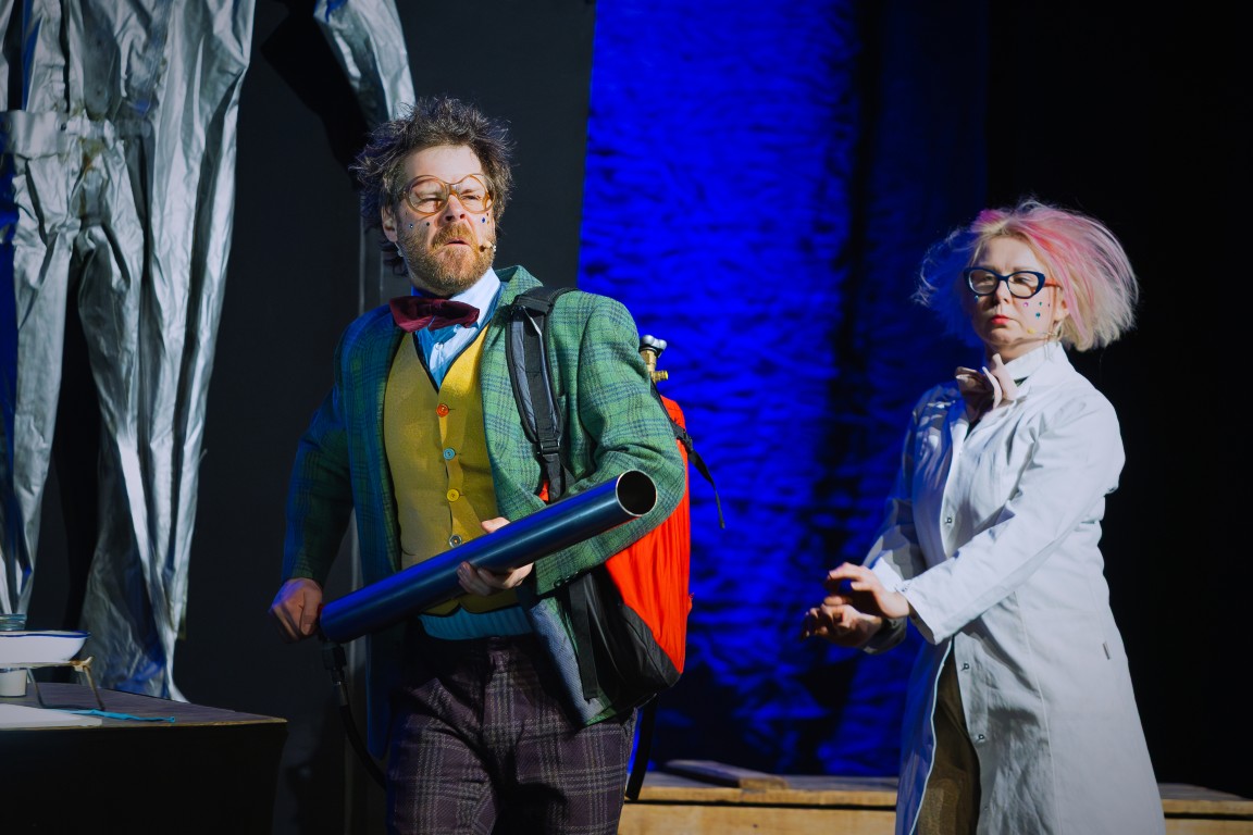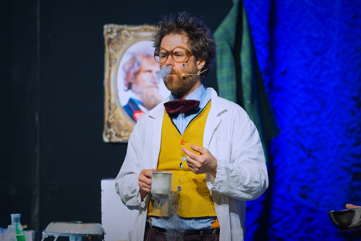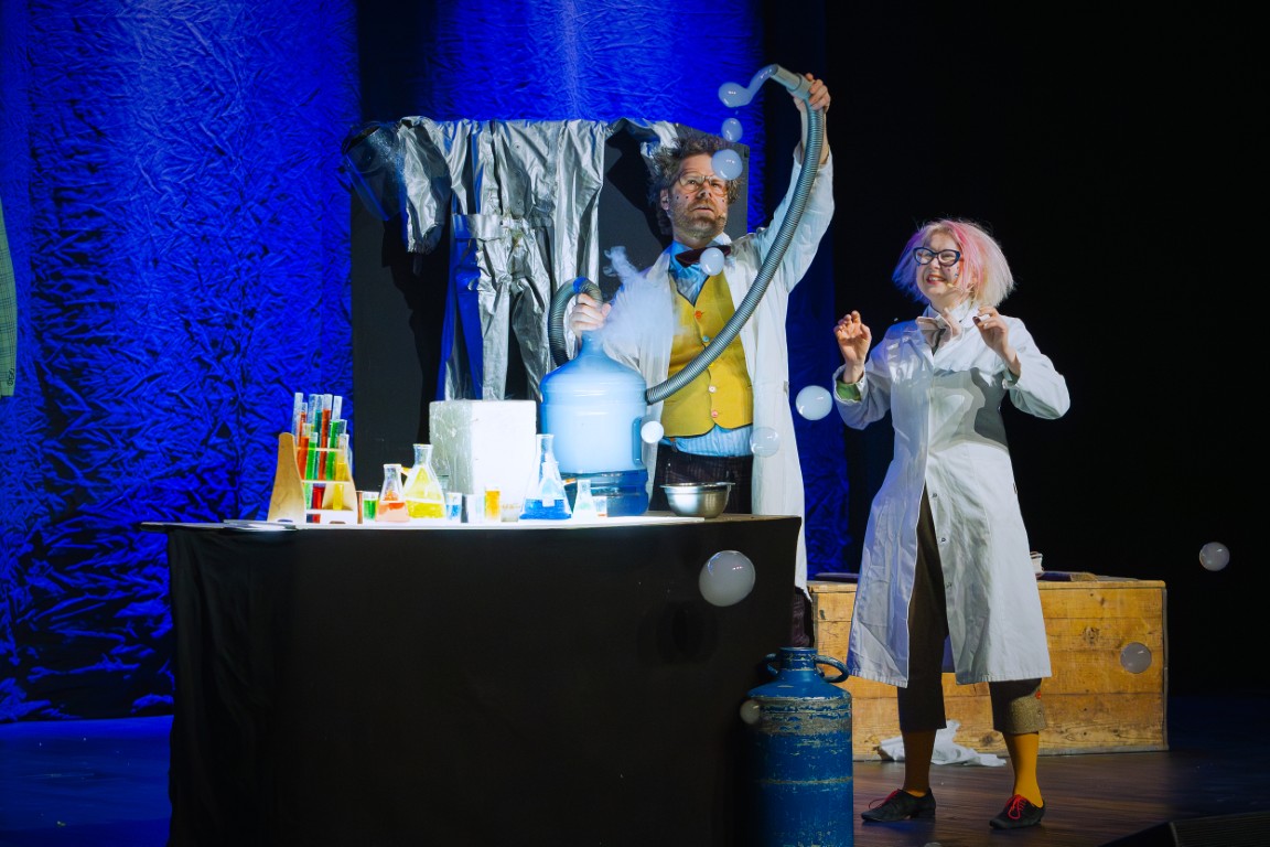 Do świata szalonych eksperymentów widzów zaprosił zwariowany duet naukowców – docent Pigwa i jego asystentka Hegel, którzy z czeluści swojej pracowni badawczej wydobywali coraz to nowe wynalazki, niczym magicy wyjmujący królika z kapelusza. Ich niesamowite pomysły zachwycały publiczność, raz po raz wywołując salwy śmiechu. Bo czy kosmiczny hełmofon, wyrzutnia koszulek albo specjalne urządzenie do wytwarzania dymu nie nasuwają na myśl absolutnie zbędnych wynalazków, których jedynym celem wydaje się być rozśmieszenie widzów? Po takiej prezentacji eksperymenty z lodowatą wodą, przywiezioną prosto z odległej Syberii, okazały się prawdziwą gratką, która wywołała niemałą ekscytację i dreszczyk emocji! Na scenie było podpalanie, wybuchy, mrożenie, a to wszystko przy aktywnym udziale zgromadzonych na sali widowiskowej dzieci.