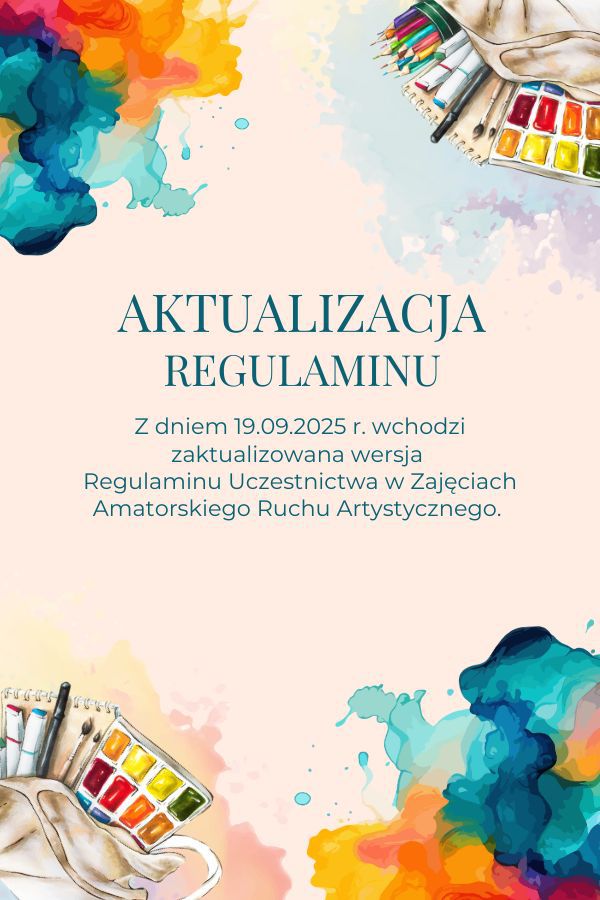 Aktualny Regulamin uczestnictwa w zajęciach Amatorskiego Ruchu Artystycznego jest dostępny na stronie Miejskiego Ośrodka Kultury i w Strefie Zajęć (https://www.strefazajec.pl/file/get/id/297075).