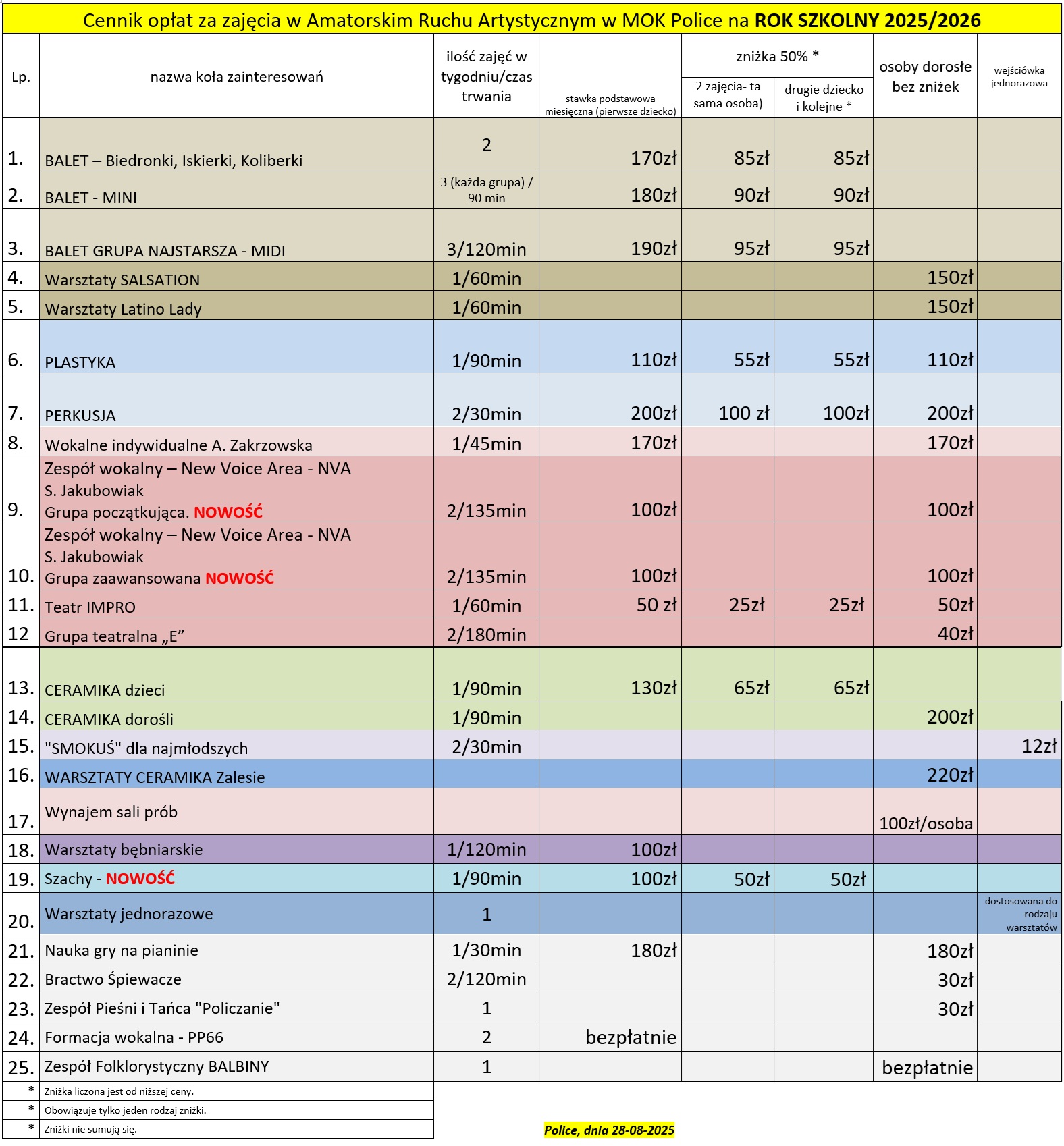 Cennik opłat za zajęcia w Amatorskim Ruchu Artystycznym w MOK Police na ROK SZKOLNY 2024/25