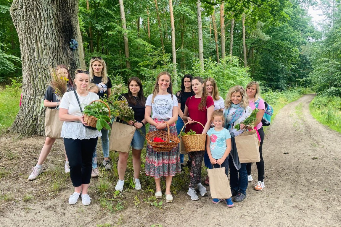 Uczestnicy spaceru zielarskiego przemierzali leśne i polne drogi w poszukiwaniu skarbów natury.