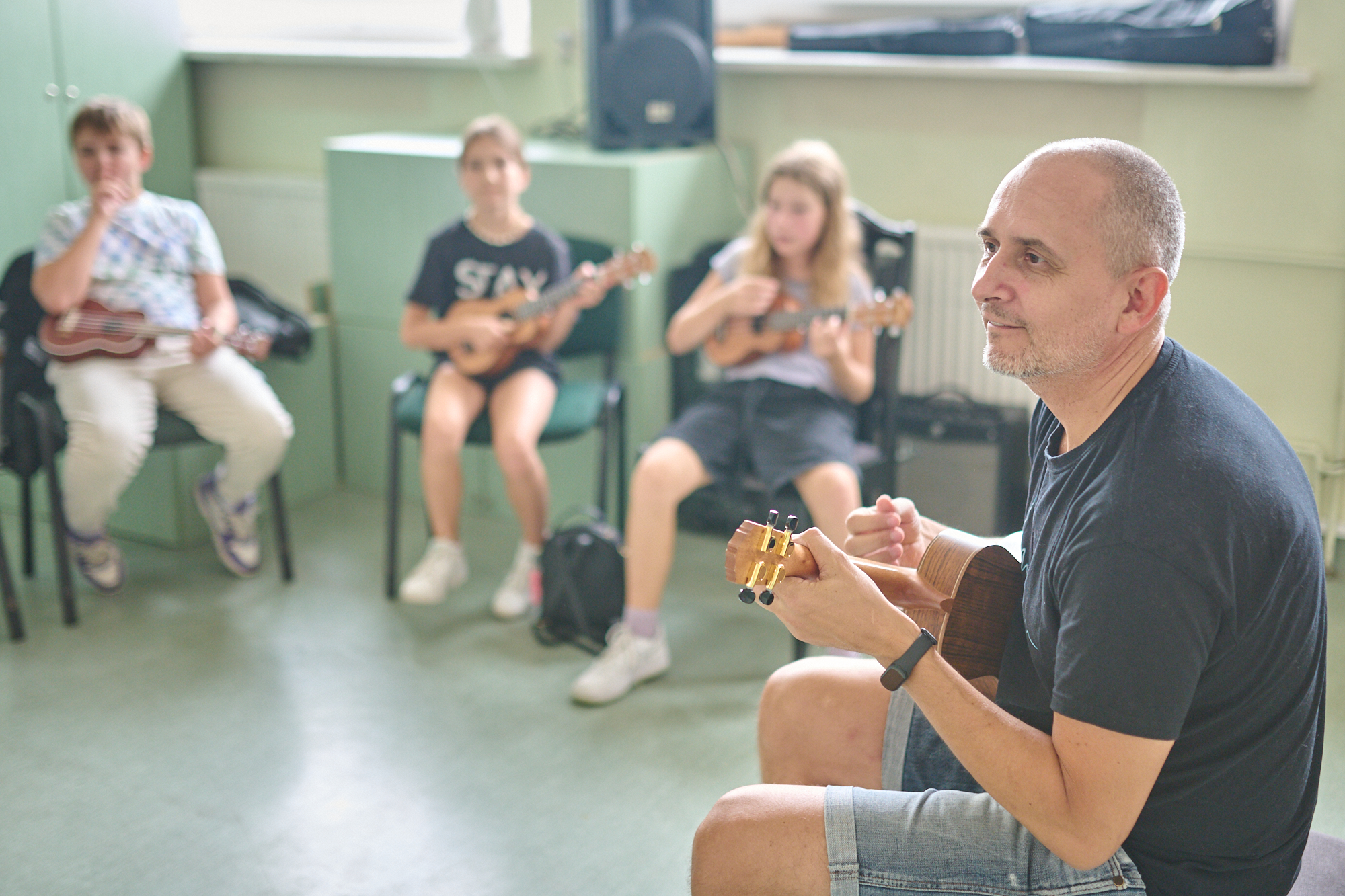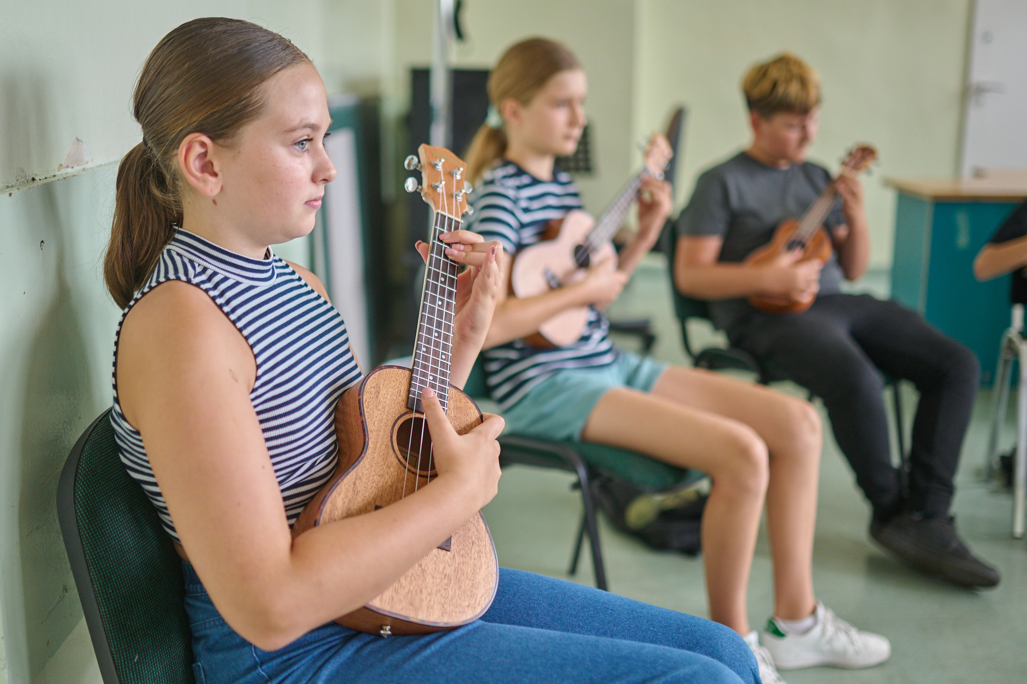 Lekcje gry na ukulele. Uczestnicy poznają podstawy gry na tym wyjątkowym instrumencie i tworzą swoje pierwsze melodie, które wypełniają nasz ośrodek pozytywnymi dźwiękami.