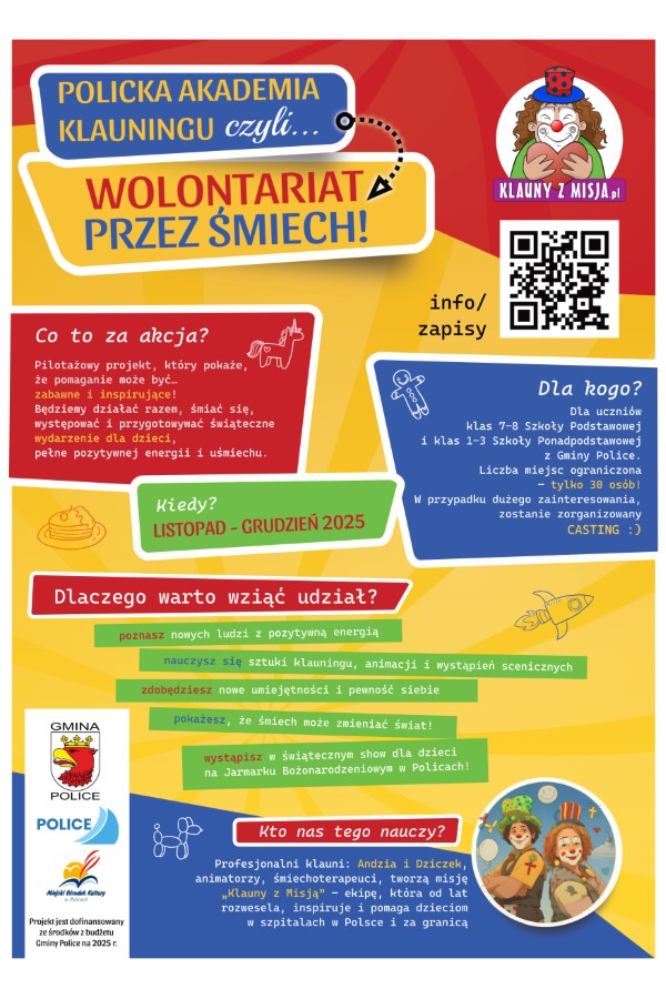 W Gminie Police rusza pilotażowy projekt, który pokaże, że pomaganie może być… zabawne i inspirujące! Będziemy działać razem, śmiać się, występować i przygotowywać świąteczne wydarzenie dla dzieci, pełne pozytywnej energii i uśmiechu Organizatorem projektu jest misja „Klauny z Misją”, we współpracy z Wydziałem Polityki Społecznej Urzędu Miejskiego w Policach oraz Miejskim Ośrodkiem Kultury w Policach.