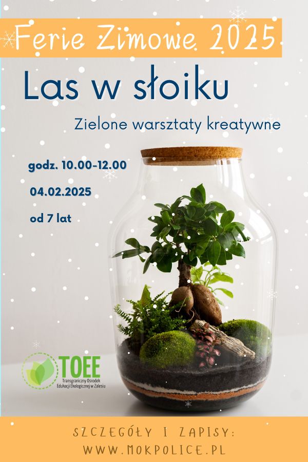Zapraszamy na warsztaty, podczas których zgłębicie tajniki przyrody, poznając rośliny i poeksperymentujecie, tworząc własny mikroekosystem, którym będziecie mogli cieszyć się we własnym domu. Tworzenie miniaturowego leśnego ogrodu nie tylko poszerzy Waszą wiedzę na temat leśnej flory, ale będzie też świetną okazją do rozwoju zdolności manualnych.