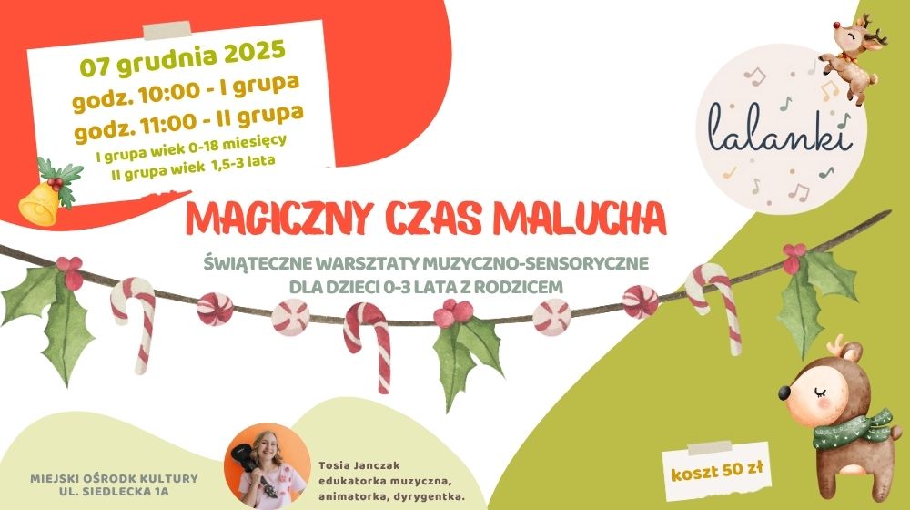 Zapraszamy opiekunów z niemowlętami i maluchami (0-3 lata) na pełne magii, świąteczne warsztaty muzyczne, które będą wspaniałą okazją do spędzenia bliskościowego czasu razem i wspólnego muzykowania w ciepłej atmosferze, którą stworzy niezwykła Tosia Janczak, twórczyni Lalanek. Podczas spotkania mali uczestnicy wraz z rodzicami/opiekunami i prowadzącą będą śpiewać zimowe i świąteczne piosenki przy akompaniamencie ciepło brzmiącego ukulele, a także grać na prostych instrumentach perkusyjnych, takich jak marakasy, dzwonki czy tamburyny. Nie zabraknie też wesołych wierszyków i rymowanek, doskonale wspierających rozwój mowy oraz zabaw z wykorzystaniem kolorowych chust i wstążek, angażujących zmysły i wspierających koordynację. Dodatkową formą zajęć będzie wspólna, swobodna zabawa sensoryczna, która z pewnością sprawi wiele radości nie tylko dzieciom, ale też ich rodzicom. Mnogość faktur, konsystencji i kolorów zapewni dzieciom doznania na wielu płaszczyznach, wpływając pozytywnie na ich ogólny rozwój. Bez obaw – zabawa nie będzie brudząca, a jedynym śladem, jaki pozostawi będzie uśmiech na twarzach małych uczestników.