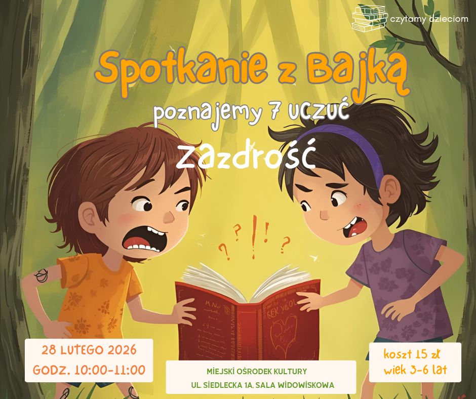 Pełen magii i nieograniczonej fantazji świat książek po raz kolejny otwiera przed nami swoje podwoje i zaprasza do tego, by na krótką chwilę utożsamić się z literackimi bohaterami, przeżywając razem z nimi codzienne radości i zachwyty, ale też niepowodzenia i smutki. Po naszych dotychczasowych spotkaniach dzieci już świetnie potrafią radzić sobie ze złością i strachem, a teraz sprawdzimy, jak zareagują na sytuacje, w których do głosu dochodzi zazdrość. Czy to uczucie da się przezwyciężyć i przekuć w coś pozytywnego? Czy z zazdrości może wypłynąć jakaś nauka? Perypetie 4-letniego liska Fenka, który musi poradzić sobie z emocjami wywołanymi narodzinami siostry i historia małej Zosi, która chciałaby – tak jak koleżanka – być chwalona za pięknie wykonane prace plastyczne, będą początkiem wspólnych rozmów o tym, co wywołuje w nas zazdrość, jak wpływa ona na nasze relacje z innymi i co zrobić, by to uczucie motywowało nas do działania. Nasze spotkanie jak zawsze będzie połączone z tańcem, śpiewem i aktywnościami, które będą wspierały rozwój emocjonalny naszych małych uczestników.
